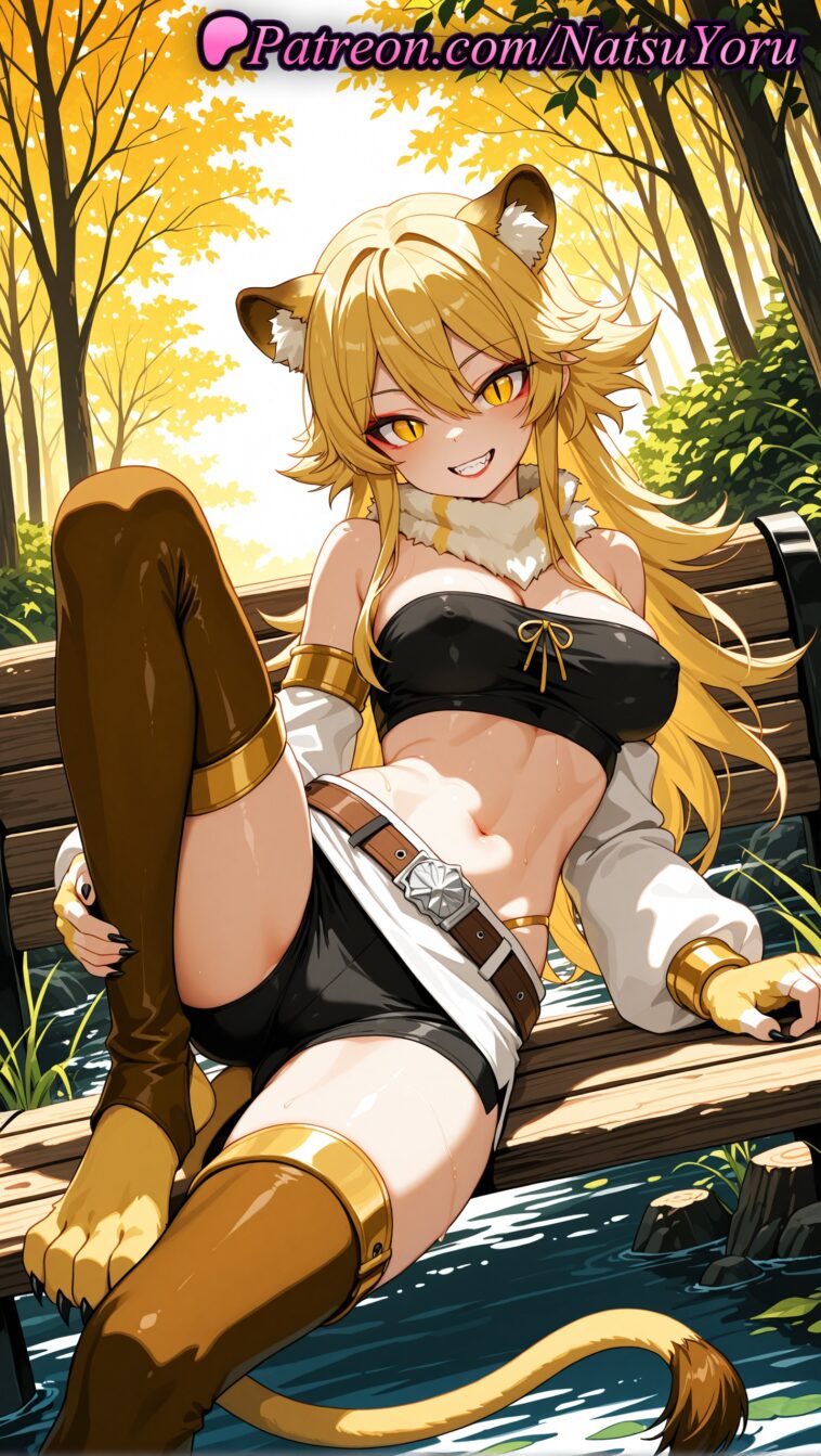 1girl 1girl 1girls 2025 ai ai_assisted ai_generated akame_ga_kill! animal_ear_fluff animal_ears animal_hands anime anime_style bandeau bangs bare_shoulders belt bench big_breasts big_breasts black_nails black_shorts black_tube_top blonde_hair breasts brown_thighhighs bust cat_ears cleavage covered_nipples crop_top detached_sleeves eyeshadow female_focus female_only fingerless_gloves foot_out_of_frame fur_collar gloves grin hair_between_eyes halter_top hentai high_quality high_res high_res high_resolution knee_up leone_(akame_ga_kill!) lion_ears lion_girl lion_tail lipstick long_hair long_sleeves looking_at_viewer makeup midriff nail_polish natsuyoru nature navel non-asian outside panties patreon pool puffy_sleeves short_shorts shorts sitting skirt slit_pupils smile solo_female stable_diffusion stirrup_legwear stockings stomach strapless tail thighs tiger_tail toeless_legwear tree tube_top tubetop underwear voluptuous voluptuous_female water yellow_eyes
